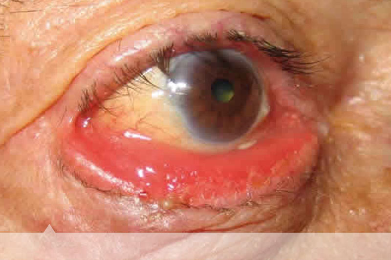 Síntomas La superficie húmeda interna conjuntival es expuesta y visible. Usualmente, las partes inferior y superior del párpado se cierran estrechamente, protegiendo el ojo de daños y evaporación de las lágrimas. Si el borde de un párpado se evierte hacia afuera, los dos párpados no encajan de forma adecuada y las lágrimas no se pueden distribuir uniformemente sobre el globo ocular. Esto puede resultar en irritación, ardor, sensación de arena en el ojo, lagrimeo excesivo, eversión significativa del párpado y enrojecimiento de la conjuntiva en la parte superior del ojo.